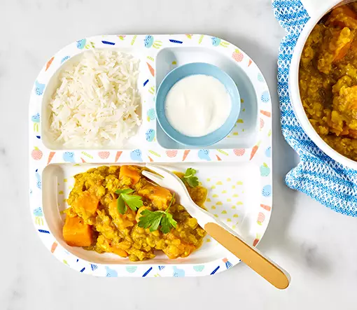 Uses the Rafferty’s Garden Red Lentil, Carrot & Sweet Potato pouch.